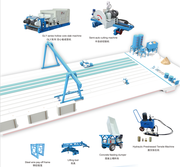 GLY系列的空心板机是先做好混凝土平台上生产作业,预先张拉好高强度、低松弛钢绞线,运用挤压推进的工作原理来制造混凝土空心板,所生产出来的板材具表面光滑,密实度高、跨度大等优点。生产出的空心板长度可在4. 2米到18米的范围内任意切割,主要用于建造大开间厂房、住宅、学校、医院、商场、办公楼和大型仓库等建筑物。